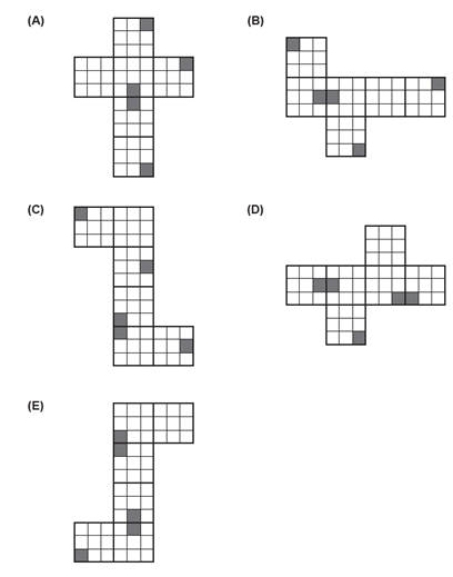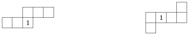 Na obrázku sú siete kocky. Na steny siete napíšte čísla 2 až 6 tak, aby po zložení kocky číslo 1 bolo dole, číslo dva vzadu, číslo tri vpravo a aby súčet čísel na protiľahlých stenách bol vždy 7.