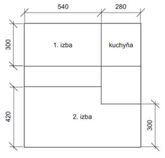 Na obrázku je nakreslený pôdorys dvojizbového bytu. Rozmery sú uvedené v centimetroch. Výška všetkých miestností je 280 cm. Majiteľ bytu plánuje klimatizovať priestor väčšej izby. Určte vo wattoch minimálny potrebný výkon klimatizačného zariadenia väčšej izby, ak na klimatizovanie 1 metra kubického priestoru je potrebný výkon 31 wattov.