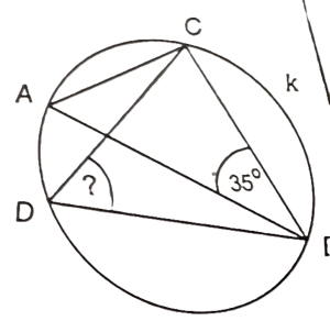 Na obrázku je kružnica k, na obvode ktorej sú zvolené štyri body A, B, C, D. Úsečka AB je priemerom kružnice. Ak uhol ABC meria 35°, aká veľkosť má uhol CDB?