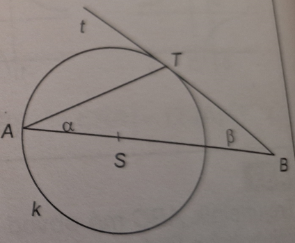 Na obrázku je kružnica k, ku ktorej je z bodu B zostrojená dotyčnica t s bodom dotyku T. Ak priamka AB prechádza stredom kružnice, potom bez ohľadu na polohu bodu B pre veľkosti uhlov α, β platí: