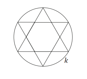 Do kružnice k je vpísaný geometrický útvar, ktorý sa skladá z pravidelného šesťuholníka a šiestich rovnostranných trojuholníkov (obr.). Strana trojuholníka má dĺžku 4. Aký je polomer r tejto kružnice?