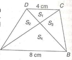 Lichobežník ABCD so základňami dlhými 8 cm a 4 cm je svojimi uhlopriečkami rozdelený na štyri trojuholníky s obsahmi \(S_1\), \(S_2\), \(S_3\), \(S_4\) (pozri obr.). Ktorá z uvedených rovností neplatí?